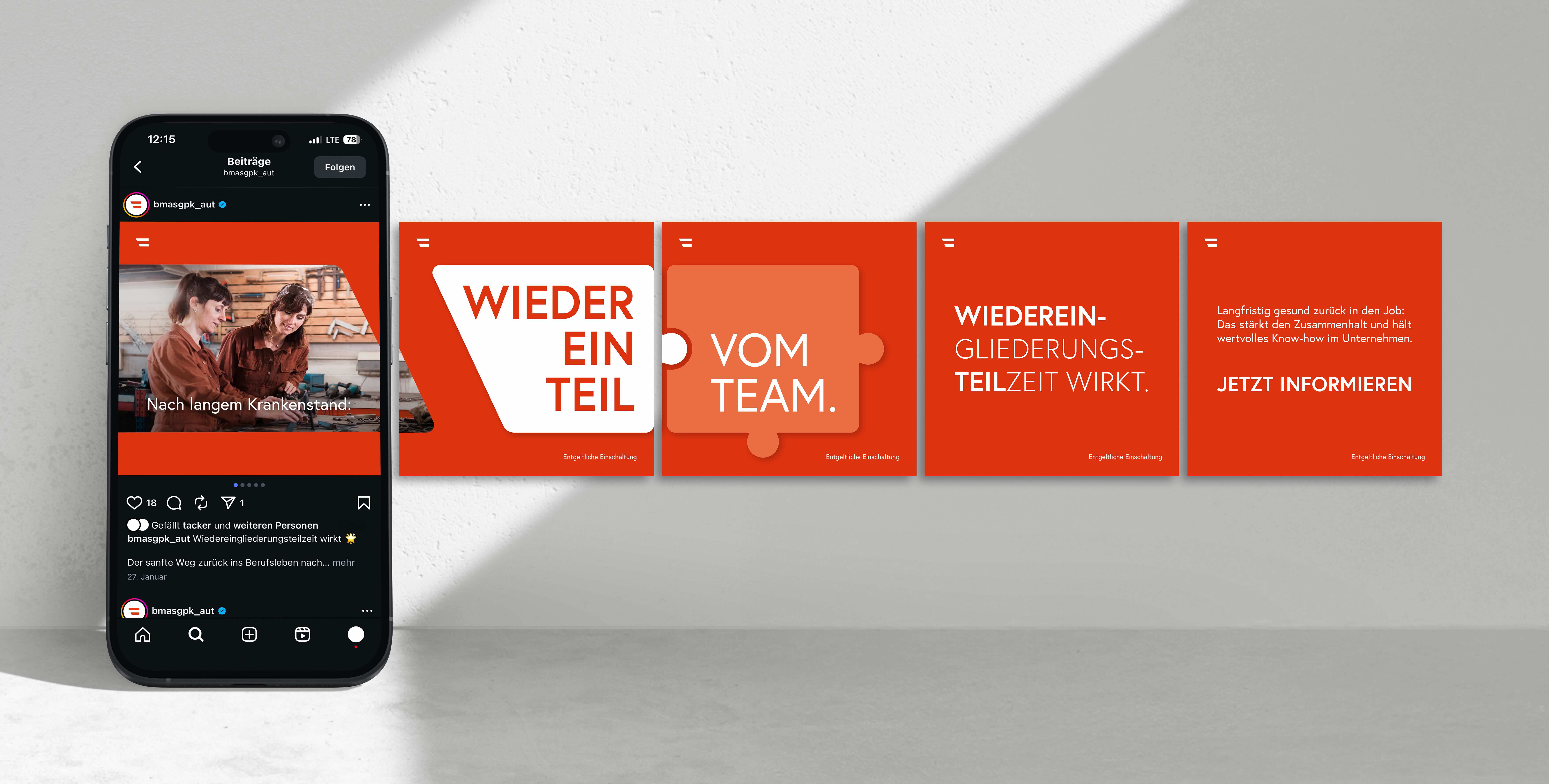 In Kombination mit einem Design und einer Bildwelt, die das positive Gefühl der schrittweisen Rückkehr in den Job visuell unterstreichen, wird auf Social Media, Stakeholder-Plakaten, in Advertorials und in Spots sofort klar: Mit der Wiedereingliederungsteilzeit werden Menschen langfristig gesund „Wieder ein Teil vom Team.“